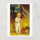 Vintage Halloween-Grußkartenabbildungen zeigen ein Viktorianisches Kind, das von einer schwarzen Katze am Fenster erschreckt wird.