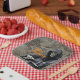 Auf der Fun-Halloween-Party-Platte steht Foto des Grim-Sensenmanns, der sich mit einem anpassbaren Text auf seine Hose stützt.