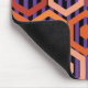 Dieses Mauspad hat ein geometrisches Design von Sechsecken in vier Orangetönen auf einem Feld aus schwarzen und lila Streifen.