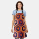 Diese Schürze hat ein geometrisches Design von Sechsecken in vier Orangetönen auf einem Feld von schwarzen und lila Streifen.