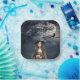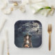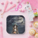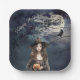 Eine hübsche Halloween-Hexe in einem schwarzen Hut und Kleid hält einen kleinen Jack o’ Laterne, während ein Rabe von einem Baumzweig aus schaut. Eine riesige Fledermauskolonie fliegt über einen Vollmond am Nachthimmel über ihr.