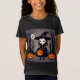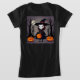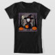 Niedliche Abbildung einer jungen Hexe mit orangefarbenen Haaren, umgeben von Jack-o'-Laternen. Die zauberhafte Atmosphäre wird von Fledermäusen unterstrichen, die unter einem orangefarbenen Mond fliegen und eine verspielte Halloween-Stimmung erzeugen.