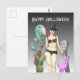 Die hübsche Hexe steht mit ihren lustigen und gruseligen Freunden auf einer Halloween-Postkarte.