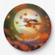 Papierteller mit meinem originellen Design einer Hexe auf einem Besen, der von Vollmond fliegt und Herbstblätter um sie fliegen. Im Text steht: "Happy Halloween!"