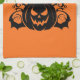 Küchentücher werden in orangefarbener Farbe mit einem Kürbisprint der Halloween-Zeit gezeigt. Passen Sie dieses Objekt an oder kaufen Sie, wie es ist.