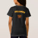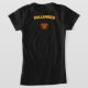 Ein lebhaftes Halloween-Design mit einem leuchtenden Kürbis mit hellen Augen und Zähnen in einer dunklen Landschaft mit Bäumen und Raben.