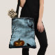 Ein lebhaftes Halloween-Design mit einem leuchtenden Kürbis mit hellen Augen und Zähnen in einer dunklen Landschaft mit Bäumen und Raben.