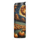Die KI schuf die Kunst einer lebhaften Herbstszene mit einem riesigen, leuchtenden Mond, der mit bunten Blätter geschmückt ist und einen Blick auf ein riesiges Kürbisfeld bietet.
