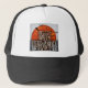 Diese Grafik zeichnete, wurde digitalisiert in, Foto-Bearbeitung, um dieses lebendige, orange-gelb, Mond, mit fliegenden Fledermäusen, in einem blassgrauen, farbigen, Himmel und angezeigt, mit einem bekannten, gotischen Satz, "Happy Halloween".