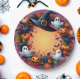 Diese lebhafte Halloween-Illustration zeigt eine zentrale glühende Jack-o’-Laterne mit einem Hexenhut. Um den Kürbis herum befinden sich verschiedene Elemente, die Halloween betreffen, darunter Geister, Fledermäuse, Spinnennetze, die sich über Noten, Kerzen und Herbstblätter erstrecken. Die Farbpalette ist vorwiegend düster, mit orangefarbenen Pop aus Kürbissen und blassen Elementen wie Geistern und Kerzen, die Kontrast schaffen. Diese Teller eignen sich hervorragend, um jedem Anlass eine Touch Halloween-Magie hinzuzufügen. Sie sind ideal für Party und Feiern.