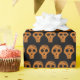 Orangefarbenes und schwarzes Schädelmuster auf Halloween-Geschenkpackung.