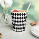 Der Papierbecher aus Halloween-Party wird mit einem harlequin-Diamantdruck gezeigt. Farbe Schwarz/Weiß Passen Sie dieses Objekt an oder kaufen Sie, wie es ist. Börsenbild vecteezy.com
