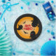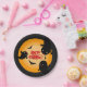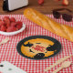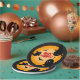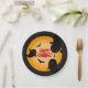 Cute Halloween paper party plates with black ghosts and bats against an orange background. Happy Halloween is written in the center.