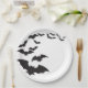 Die Papiertafel aus Halloween-Party wird in weißer Farbe mit Fledermausdruck dargestellt. Passen Sie dieses Objekt an oder kaufen Sie, wie es ist. In 9" Größe angezeigt. Verkauft in Paket mit acht.