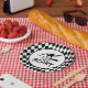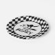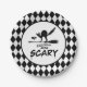 Die Papierplatte wird mit einem Halloween Harlequin-Druck gezeigt. Farbe Schwarz & Weiß Passen Sie dieses Objekt an oder kaufen Sie, wie es ist. Bild
