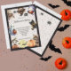 Diese niedliche Einladung umfasst niedliche Katzen, Gespenster, Spinnen und Fledermäuse. Die Worte "Halloween-Party" sind in einem lustigen und festlichen Schriftart geschrieben. Sie können die Einladung zum Halloween-Party Ihrer Kinder personalisieren. Die Rückseite hat zwei Spinnen und Sterne in lila, orange und schwarz.