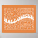 Dieses auffällige Halloween-Design zeichnet sich durch eine fette und spielerische Wiederholung des Wortes "HALLOWEEN" in einem welligen, rückwärts inspiriert Schriftart aus. Der Text ist in mehreren Ebenen angeordnet, wodurch ein visuell dynamisches Muster entsteht, in dem der Betrachter gezeichnet wird. Das zentrale Wort wird in einer soliden, lebendigen Orange hervorgehoben, wodurch es sich von dem umgebenden Text abhebt, der in derselben Farbe dargestellt ist. Die gewellte Typografie verleiht dem Halloween-Geist ein Gefühl von Bewegung und Energie, das ihn perfekt einfängt.