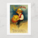 Vintage Halloween-Grußkarten-Illustration, die ein Viktorianisches Kind zeigt, das eine Jack-Laterne mit dem Text "Es ist Halloween, wenn kleine Jungen vom leisesten Lärm erschreckt werden, und kleine Mädchen ins Bett laufen und schnell klettern und ihren Kopf verstecken."