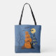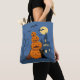 Niedliche schwarze Katze und Hexenbesen in der Nähe eines Stacks lachender Kürbisse, die umfallen. Ein toter Baum, ein gruseliges Herrenhaus, ein paar Fledermäuse und der Mond sind im Hintergrund zu sehen.