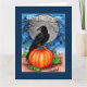 Ursprüngliche Malerei von Sandra-Sturm eines großen schwarzen Raben, gehockt nach einem Kürbis unter dem Vollmond nachts. Großer Entwurf für Kinder und Erwachsene und eine Spaßweise, ein gespenstisches und beängstigendes Halloween zu feiern!