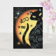 Eine beängstigende, aber trendy, dekorative schwarze Katze mit dem Durchbohren der gelben Augen starrt heraus von der Dunkelheit auf dieser modernen Halloween-Karte an.
