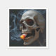 Ein Schädel hält ein Stück Süßmais in den Zähnen, was skurrile Wirbel von Rauch auslöst