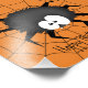 Whimsical Cartoon schwarze Spinne mit großen lustigen Augen und kleinen weißen Reißzähnen, krabbelnd über sein Netz. Unter der Spinne ist eine Vorlage, die Happy Halloween liest. Dies kann so verwendet werden, wie es ist oder durch Ihren eigenen Text ersetzt werden.
