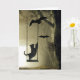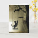 Schwarze Katze auf einem Baumschwingen in einem gespenstischen Abend spielt mit den schwärmenden Schlägern und lädt Sie ein, euch Halloween-Grußkarte anzuschließen