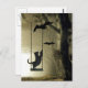 Schwarze Katze in einem spöttischen Abend-Schaukel spielt mit den schwärmenden Fledermäusen und lädt Sie ein, an Halloween Postkarte teilzunehmen