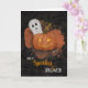 Halloween-Karte mit dunklem, launischem Hintergrund und einem Aquarellfarben-Jack o'Lantern und einem Geist, der hinter dem Kürbiskürbis Sprichwort Boo auftaucht!