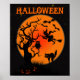 Halloween Spuk Place Poster. Cooles Poster in Schwarz und Orange mit einem Spuk Ort. Ein unheimlicher Baum mit einer Eule, eine Hexe auf einem Besen, Fledermäuse, eine schwarze Katze und Kürbislaternen bilden dieses Bild eines Spuk Ortes.