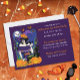 Ein Zuckerschädel inmitten einer schwarzen Katze, Kessel, Fledermäuse, Vollmond, Monarchschmetterlinge und Kürbisse in einem lila und blauen Hintergrund