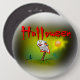 Auf diesem Bild steht Halloween in rot. Der Geist hat ein Lächeln auf seinem Gesicht und schwebt über die Landschaft mit der Sonne im Hintergrund. Die Hexe fliegt auf ihrem Besenstiel. Diese Knöpfe werden in einem quadratischen und runden Sortiment mit der Rundung in einer Auswahl von Formen und Größen.