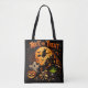 Diese lebendige Halloween-Illustration bringt alle klassischen gruseligen Symbole in einer auffälligen Szene zusammen. Ein leuchtender Vollmond setzt die Bühne, während eine Hexe über den Himmel fliegt, umgeben von flatternder Fledermäusen. Darunter erhebt sich ein Spukhaus mit leuchtenden Fenstern aus einer schattigen Landschaft mit kahlen Bäumen und schiefen Grabsteinen.