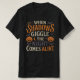 Dieses einzigartige Halloween-T - Shirt-Design zeigt ein handgezeichnet Zitat: "Wenn Schatten Giggle, The Night kommt live". Auf dem Gelände befinden sich Halloween-Symbole wie Jack-o'-Laternen, Fledermäuse, Halbmond und Spinnennetze. Eine perfekte Grafik für diejenigen, die mysteriöse, lustige und lustige Herbstvibes Liebe haben - ideal für saisonale Mode oder Halloween-Partys