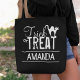 Ein typografisch inspiriertes Design mit einer spukhaften KatzenSilhouette. Script Schriftart zusammen mit Block und lustige Typografie. Ein einfaches Schwarz-Weiß-Design mit geometrischen Linien und Quadraten. Personalisieren Sie diesen skurrilen schwarzen Katzentrick oder bedienen Sie sich selbst oder Ihre kleine Hexe, Geist oder Goblin. Frohe Halloween zu allen an All Hallows Eve. Dieses Design umfasst Halloween-Trick- oder Leckereien-Taschen, Halloween-Schwarzkatzenpferde, niedliche Kleinkinderkinder, schwarz-weiße Typografie-Schrift, sprichwörtliche gotische Kätzchen lustig, lustig, lustig, minimalistisch einfach, Herbsttier im Oktober, beängstigende klassische moderne Namen, Spaß gruselig-coole Kindertaschen