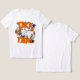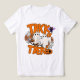 Halloween Trick oder Treat Ghosts Skulls Pumpkin Bat Typografie Womens T - Shirt zeigt den Text "Trick or Treat" in modernen orangen Schriftzeichen Typografie mit Gespenstern, einer Fledermaus und Schädeln. Ideal für Halloween-Partys. Von Evco Holidays entworfen www.zazzle.com/store/evcoholidays