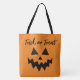 Die perfekte wiederverwendbare Halloween Trick oder Treat Tote Tasche mit einer Kürbislaterne Kürbisgesicht in schwarz auf orangefarbenem Hintergrund, oben mit den Worten "Trick or treat".