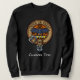 Halloween Wappen Abzeichen mit fliegender Fledermaus, umgeben von einem Gurt und Schnallen über dem Tartan Hintergrund. Eigener Text.