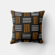 Dieses Kissen hat ein modernes Design, das wie ein Gewebe mit orangefarbenen und weißen Linien auf einem schwarzen Feld aussieht.