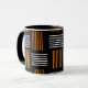 Diese Tasse hat ein modernes Design, das wie ein Weber mit orangefarbenen und weißen Linien auf einem schwarzen Feld aussieht.