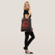 Die rustikale Halloween-Szene hat ein Spuk Haus, gruselige alte Bäume und eine Hexe, die durch den Himmel fliegt. Die Szene ist in einem tiefen orangefarbenen Mond auf einem gebrochenen schwarzen Hintergrund. Der Hintergrund ist in einem schwarz-orange gestreiften Muster eingebettet. Es sagt Happy Halloween in einem gekrümmten Text um den Mond herum. Die Rückseite ist die gleiche. Diese coole Tasche eignet sich hervorragend für Trick oder Behandlung von Jahr zu Jahr.