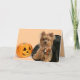 Lustige Halloween-Karte! Der niedliche Hund, der ganz oben für Halloween gekleidet wurde, möchte wirklich eine Leckerei! Große Karte für Kinder und Hundeliebhaber!