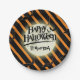 Halloween Streifen in schwarz, orange und Fledermäuse-Muster. Mit Vollmond Abzeichen mit Fledermäusen und individualisierbarem Namen. Personalisieren Sie, indem Sie den Namen ändern. Happy Spooky Halloween!