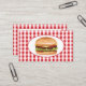 Desteis Beispiel eines Hamburgers, der einen Sesam-Samenbrunnen hat, der mit Käse, Salat, Rindfleisch, Tomaten, Ketschup und Beizen gefüllt ist. Der Hintergrund hat ein rotes Gingham-Muster. Es gibt auch personalisierbare Textbereiche für Firmennamen und Kontaktinformationen.