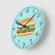 Diese Uhr zeigt eine köstliche Cartoon-Abbildung eines Hamburgers. Der Burger besteht aus Fleisch, grünem Salat, roten Tomaten, Zwiebeln, Käsezwiebeln und ein paar Pickeln. Die Knospe sieht frisch gebacken aus und hat Sesamsamen darauf. Das Uhrengesicht besteht aus stilvollen schwarzen Zahlen.