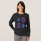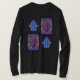 Pünktlich zum Herbst! Machen Sie mit diesem langärmeligen Damenbaumwollpullover ein Modestatement mit einem Flickwerk aus Leslie Sigal Javoreks original Hamsa Designs in reichen Pflaumen, Veilchen & Kobalt. Einzigartig Sie!