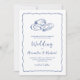 This whimsical coastal wedding invitation features a wavy scallop frame, hand drawn oyster shells, and handwriting script, with watercolor navy blue stripes on the back. It is perfect for Cape Cod weddings, or any east coast wedding on the rocky beaches from Maine to Nantucket and beyond.