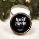 Diese trendigen, schwarzen Verpackungs-Etiketten für kleine Unternehmen mit weißer Retro-Typografie auf dunkelschwarzem Hintergrund. Im Text steht "handgefertigt", und es gibt Platz für Ihren Namen oder Ihren Firmennamen und den Namen Ihres Produkts. Ein berufliches und stilvolles Design, das sich perfekt für jedes Produkt eignet, wie Kerzen, Kleidung, Handwerk und Keramiken.