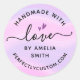 Runde Aufkleber mit dem Text "handgefertigt mit Liebe" und Ihrem individuelle Name und Website-URL oder anderen benutzerdefinierten Text auf einem rosa lila Wirbel Hintergrund. Das Wort "Liebe" ist in einem eleganten Kalligraphieskript-Schriftart geschrieben. Verwenden Sie als Umschlag Aufkleber, Aufkleber für Geschenke und Gefälligkeiten, Produktverpackung etc. Folgen Sie uns auf Facebook: @business Schreibwarengeschäft für mehr Produkte, News, Vertrieb und mehr.